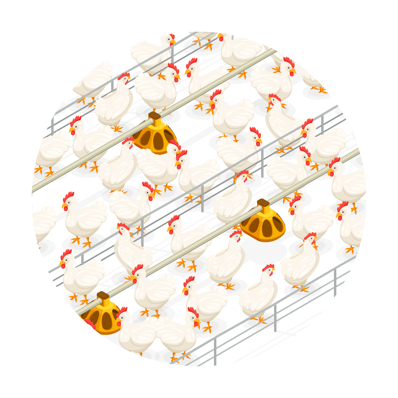 On the day 45-46, the poultry is transported to the processing shop, where they are slaughtered, cut up, and the finished products are packed, chilled or frozen.
